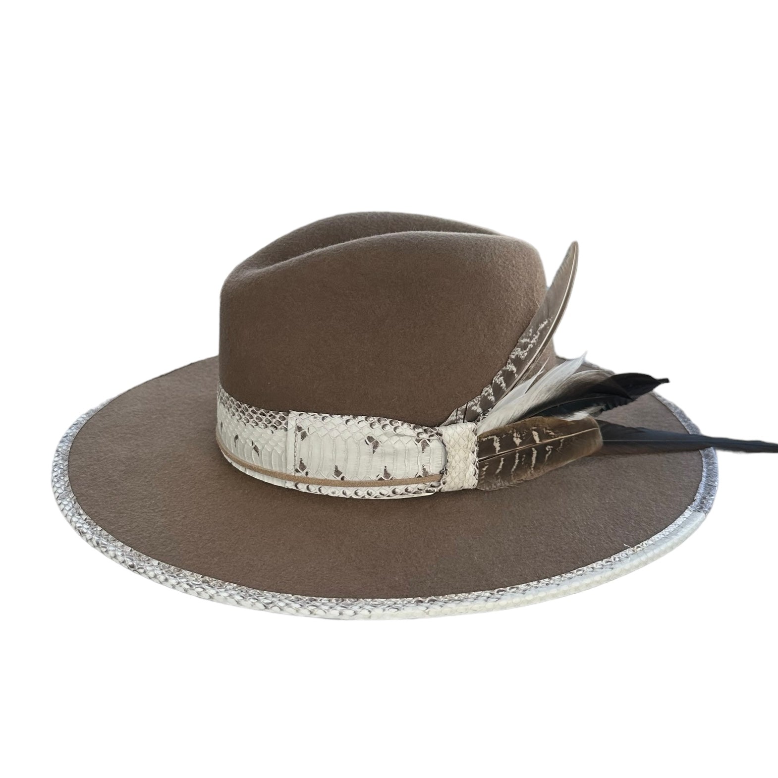 Mocha hued fur felt hat body featuring cobra hat band, and trimmed brim edge and...